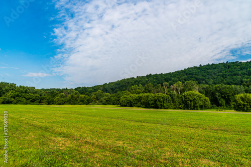 Fototapeta premium green field and blue sky with clouds