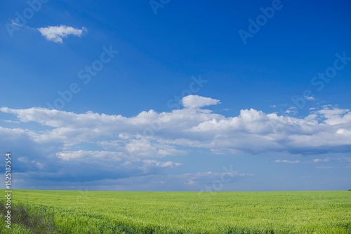 © Tetiana, Fototapeta premium Green field and blue sky with white clouds. Colorful seasonal landscape. Nature background.