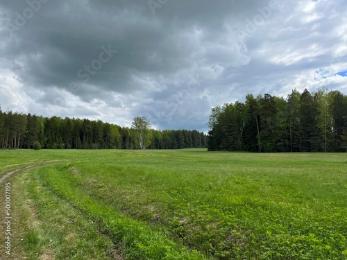 © Oksana, Obraz premium green field and forest background, cloudy sky