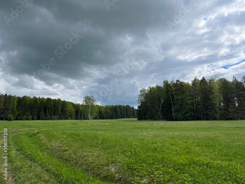 © Oksana, Obraz premium green field and forest background, cloudy sky