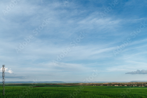 Fototapeta premium Green field and sky with clouds, grass in spring, agricultural cereal crop