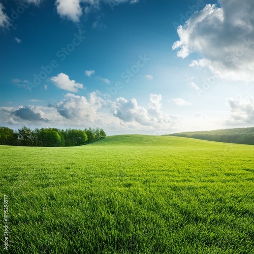 © SHAKIR95, Naklejka premium Green Field Beautiful Mount Sky and River Background AI Image