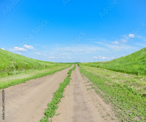 © olegdubyna, Obraz premium Green field in summer on a background of blue sky