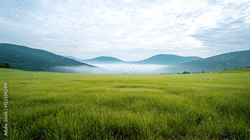 © Sujito, Fototapeta premium Green Field Landscape With Rolling Hills Under Cloudy Blue Sky And Foggy Horizon