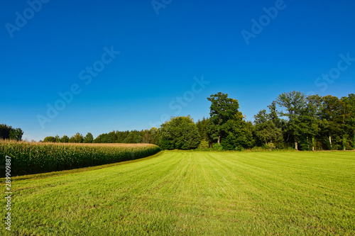 © KraPhoto, Obraz premium green field next to a corn field, in the background a forest and blue sky