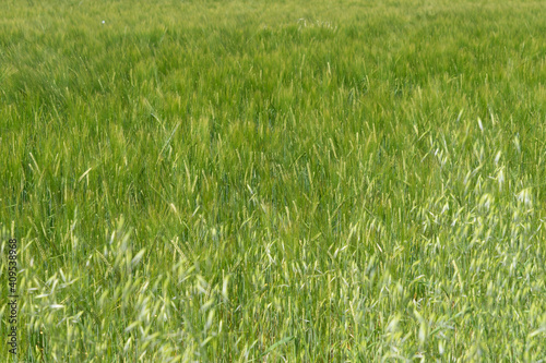 Obraz premium Green field of barley and rye in summer. In the fore blurred oat grass