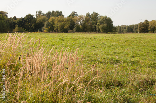 © ekramar, Fototapeta premium Green field of low grass with prelaskom fall