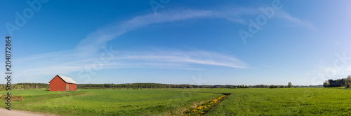 © Juha Tuomimaki, Fototapeta premium Green field panorama with red barn