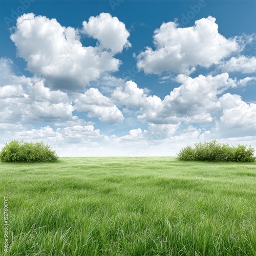 © niramol, Obraz premium Green field stretches to meet the horizon under a bright blue cloudy sky.