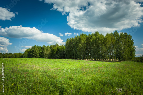 Fototapeta premium Green field, trees and white clouds on a sky