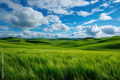 © GraphicsKB, Fototapeta premium Green field under cloudy blue sky