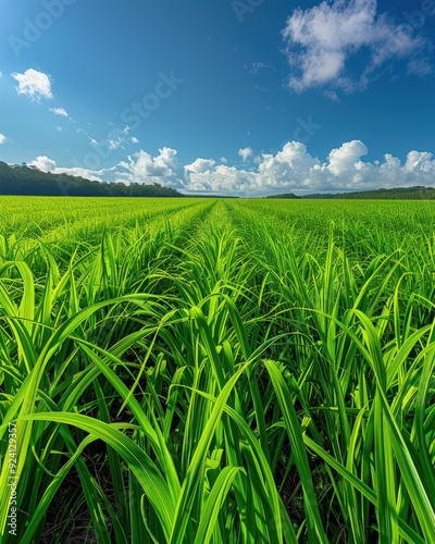 © sergio, Fototapeta premium Green field with a blue sky and fluffy clouds. AI.
