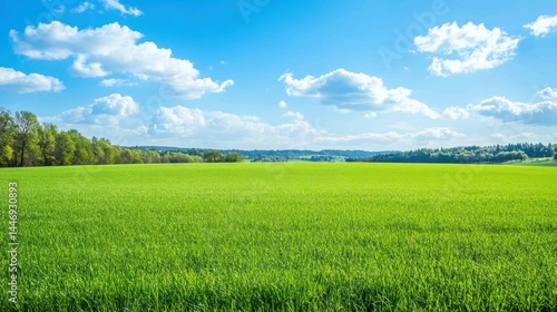 © Kumblack, Fototapeta premium Green field with blue sky. Sunny day in the countryside. Copy space.