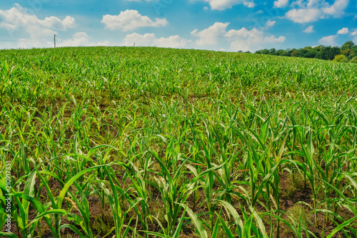 Obraz premium Green field with corn. Blue cloudy sky.