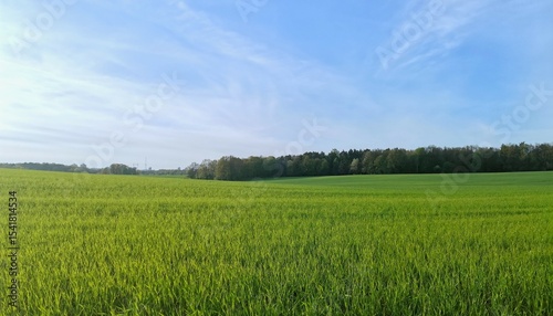 © Valery, Fototapeta premium Green field with forest in the back and blue sky