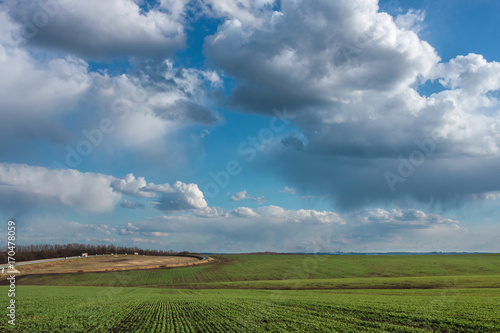 Obraz premium green field with fresh vibrant grass and blue sky with dramatic clouds at the daytime