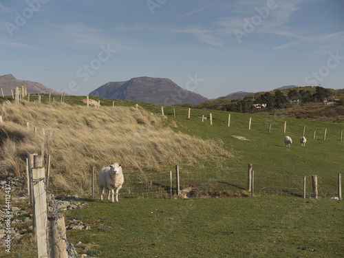 © mark_gusev, Obraz premium Green field with lambs and mountains in the background.