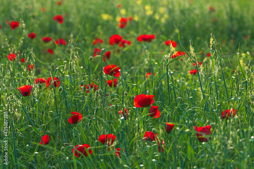 Fototapeta premium Green field with red poppies