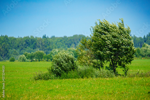 © Tommy, Fototapeta premium Green field with small trees and distant forest in summer