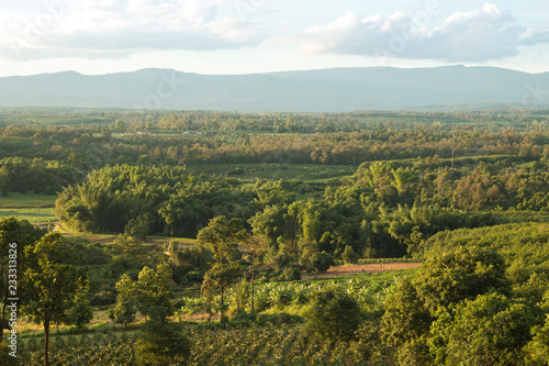 Fototapeta premium Green field with sunrise lighting with rice farm beautiful Thailand farm view