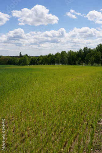 Obraz premium Green field with young spikelets of wheat against the background of beautiful clouds