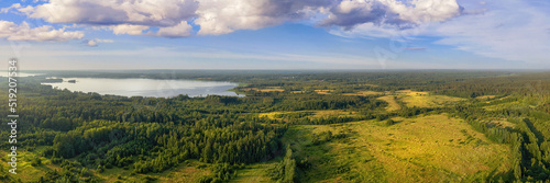 Obraz premium Green fields and dark forest aerial panoramic view
