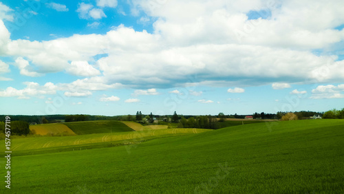 Fototapeta premium Green fields and hills in Wiezyca, Kashubian Region, Poland.