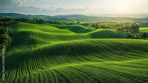 © Sang, Fototapeta premium Green fields form a geometric pattern, agricultural artistry.