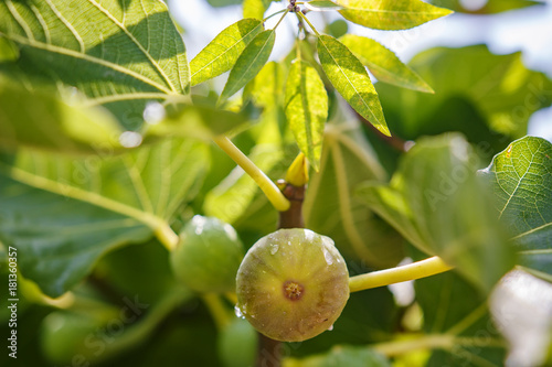 © dzmitrock87, Obraz premium Green figs growing on a tree branch.