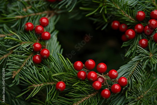 © Ali, Fototapeta premium Green fir branch frame with red berries and ornaments, creating a festive look with space for text