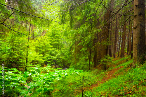 © Yuriy Kulik, Fototapeta premium green fir forest glade in light of sun