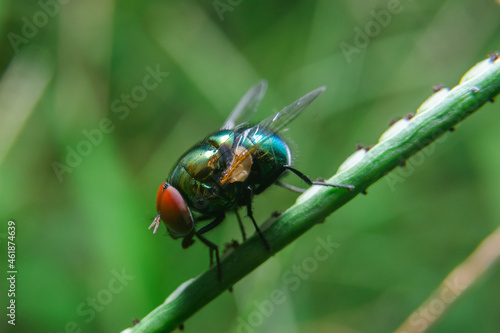 Fototapeta premium Green flies, Flies, House flies on dry leaves