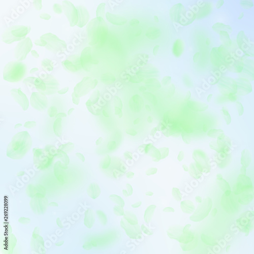 © Begin Again, Fototapeta premium Green flower petals falling down. Breathtaking romantic flowers falling rain. Flying petal on blue sky square background. Love, romance concept. Bewitching wedding invitation.