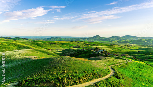 Fototapeta premium green flowering spring hills in countryside valley with rustic village road...