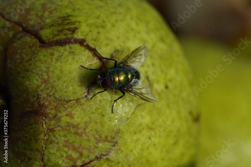 © helen_f, Fototapeta premium Green fly on white apple. Greem background.