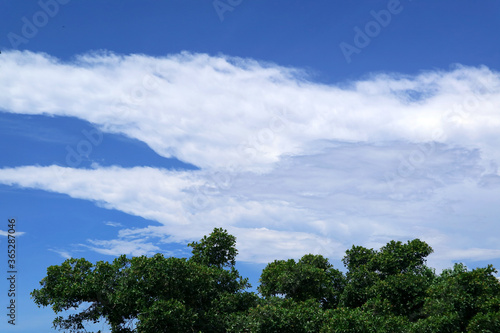 Obraz premium Green Foliage against White Clouds and Blue Sky on a Sunny Day