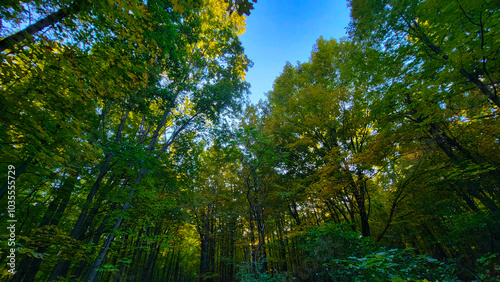 © Christelle, Fototapeta premium Green foliage in peak summer season, walk in the forest in Canada