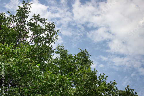 Fototapeta premium Green foliage under a white blue sky.