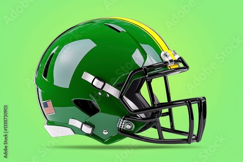 © Pairat, Fototapeta premium Green Football Helmet with Yellow Stripe and Black Facemask