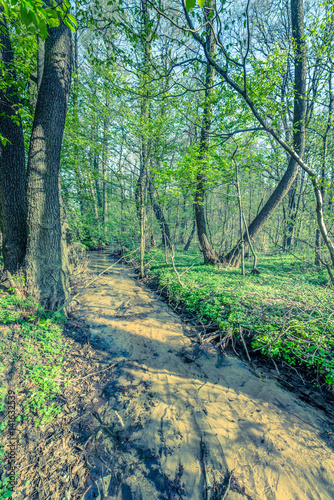 © alicja neumiler, Obraz premium Green forest and river, spring forest landscape, vintage photo