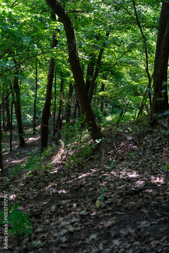 Obraz premium Green forest at Frontenac State Park on a sunny day near Frontenac, Minnesota.