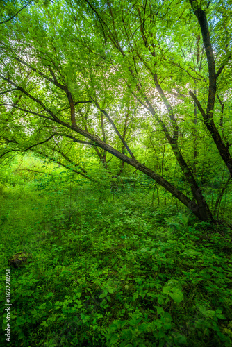 Naklejka premium Green forest at summer evening time. Trees in woods. Mystery trees . Fallen trees . Green leafs . Grass in summer