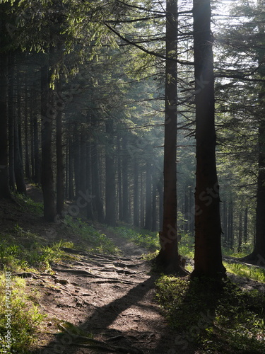 © Denia, Obraz premium Green forest background with sunlight and trees