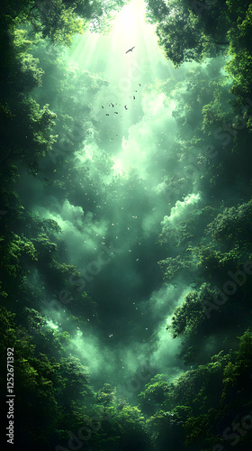 © AgungRikhi, Obraz premium Green Forest Canopy With Glowing Light