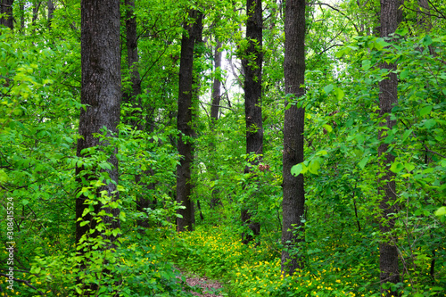 Fototapeta premium Green forest in early spring with yellow flowers.