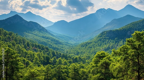 Fototapeta premium Green forest in mountain valley. Sunlight through the trees. Scenic nature landscape. Mountain range on horizon under sky with soft clouds.