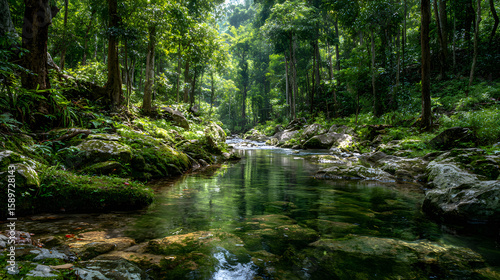 Obraz premium Green forest in sunlight with forest stream