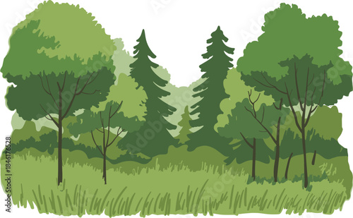 Fototapeta premium Green forest landscape illustration with trees meadow grass nature background...