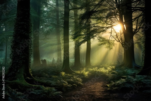Obraz premium Green forest landscape sunlight woodland.