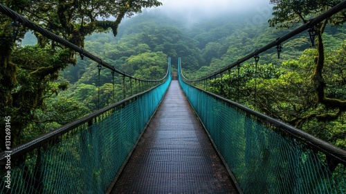 © angelmaxmixam, Obraz premium Green forest landscape. Suspension bridge over trees. Walk on hanging bridge. Explore nature. Forest scenery. Lush foliage. Adventure travel. Natural landscape. Beautiful jungle.